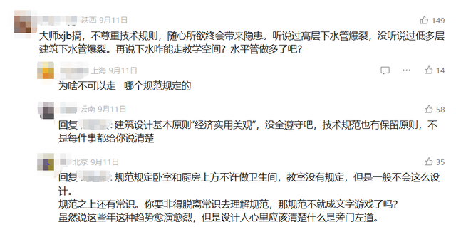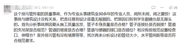 事故频发,也让不少人开始质疑建筑设计师的责任。一部分人认为,建筑师不应为这类问题背锅——管道破裂往往与材料质量、施工工艺及日常维护有关,尤其排水系统需严格按规范施工。据校方初步说明,此前排粪管破裂是因为有学生的眼镜掉入导致堵塞、压力突增所致。他们认为,主要责任应在施工方和材料供应商。